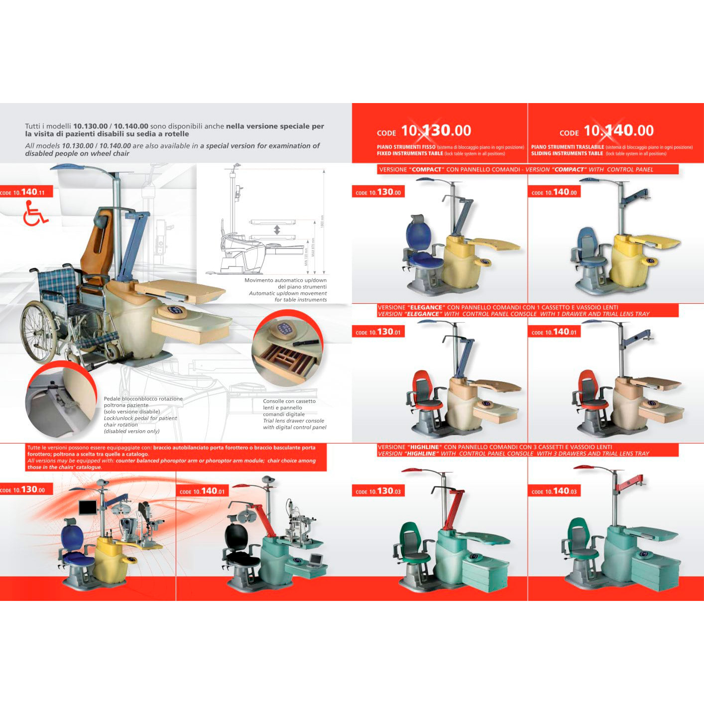 Refraction unit with manual sliding table for 2 instruments - table locking system in any position -3 different control panel consoles: "compact" no drawer (code 10.140.00), "elegance" with 1 drawer and trial lens tray (code 10.140.01), "highline" with 3 drawers and trial lens tray (code 10.140.03).