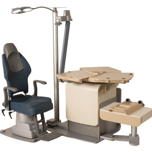 Column with adjustable LED lamp and projector support. Patient chair with electric up/down movement.