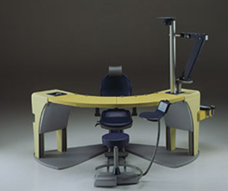 Refraction unit with modular fixed table for 3, 4 or 5 instruments. The patient and operator chairs move electrically from table to table. Console with digital control panel (operator chair side) and console with digital control panel with 1 drawer and trial lens tray (unit structure side). Column with adjustable LED lamp and projector support. The unit has an electronic control for moving back/forward, up/down and rotate the combined patient chair.