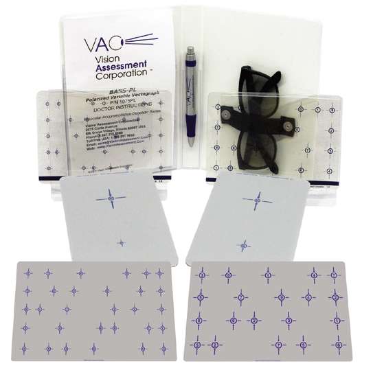 BASS-PL (Binocular Accommodative Saccadic Series) Vision Therapy System for improving patient visual performance and reading efficiency, consisting of diagnostic Fixation Disparity Targets and treatment Vectographs with saccadic identification targets at two acuity levels.