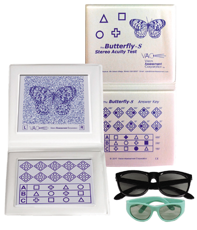 Tests designed to rapidly test for amblyopia and strabismus using gross thru fine stereopsis (2500 to 20 sec of arc). Graded circle test from 400 sec now down to 20 sec with no monocular clues. New improved booklet has answer key on back cover and includes both adult and child polarized viewers.