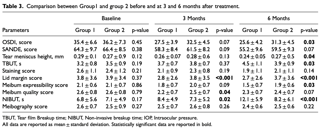 4. Ocular Surface Disease Index (OSDI): The OSDI scores decreased significantly in both groups, indicating an improvement in symptoms. However, the decrease was more significant in the light therapy group.