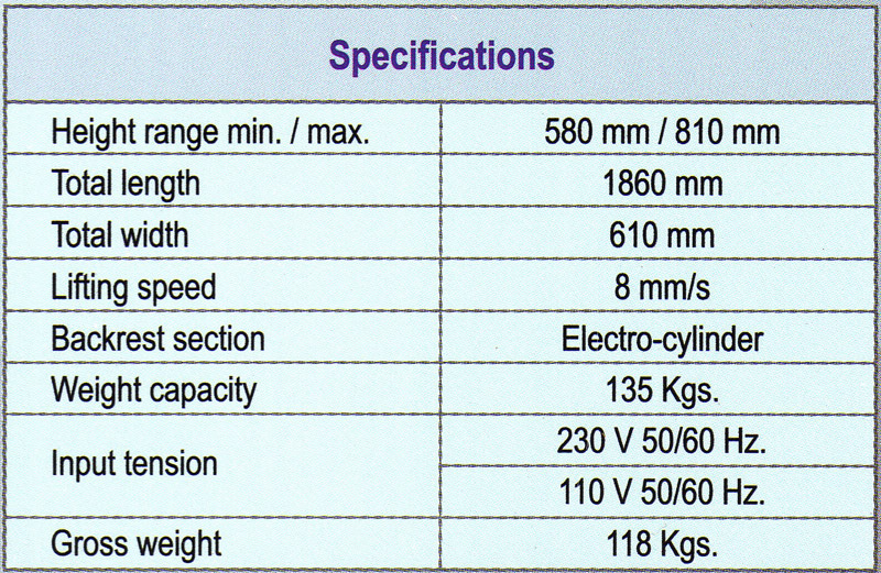 Motorised vertical height adjustment for comfort sitting or standing, head rest assures relief and restraint during operations. Patient-friendly antistatic cushions.