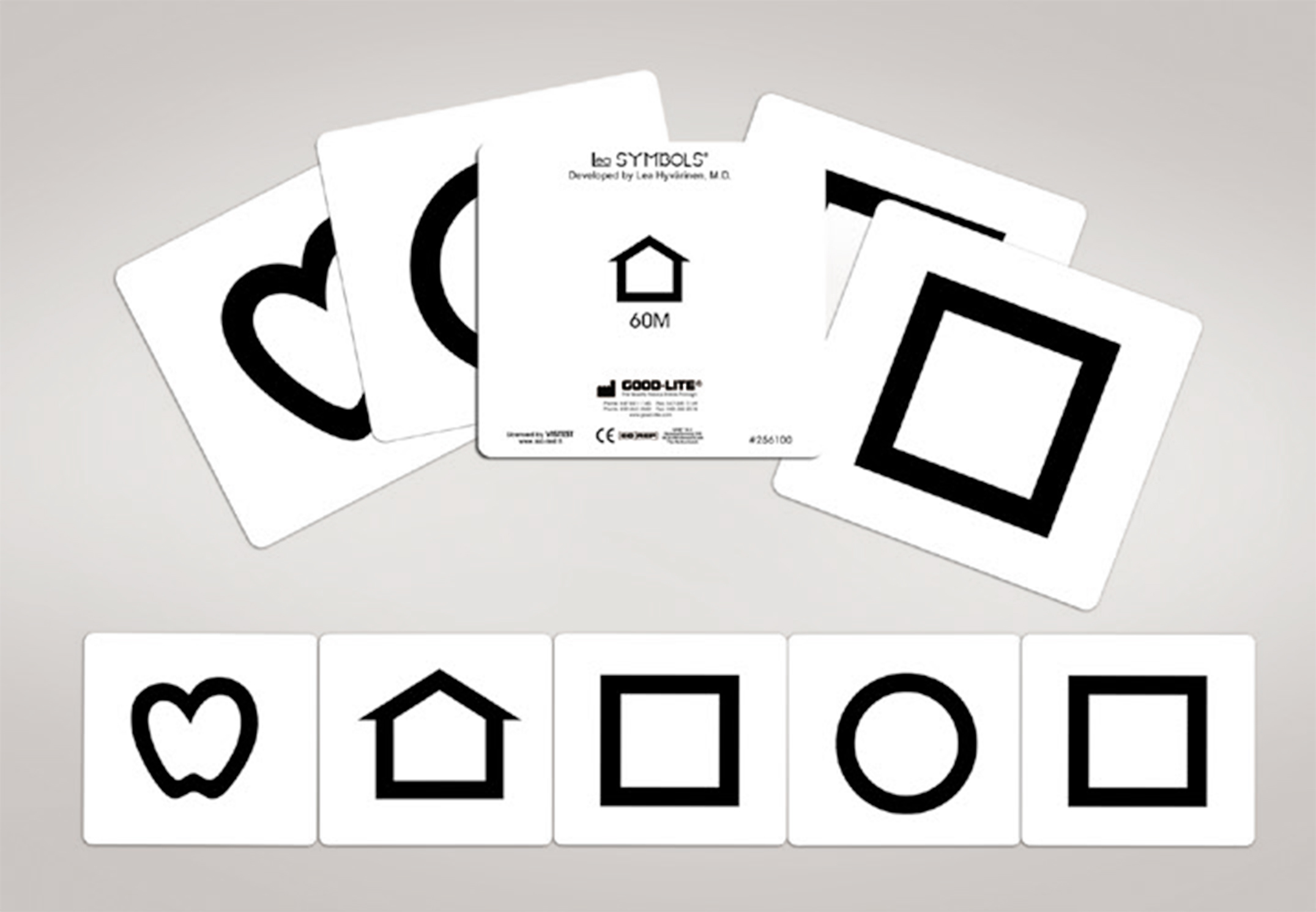 These five LEA SYMBOLS® Cards can be used for presentation as single optotypes or arranged in a row as a line test. 60M cards are approximately 8.6" x 8.6" (21.9 cm x 21.9 cm). 40M cards are approximately 6" x 6" (15.25 cm x 15.25 cm).
