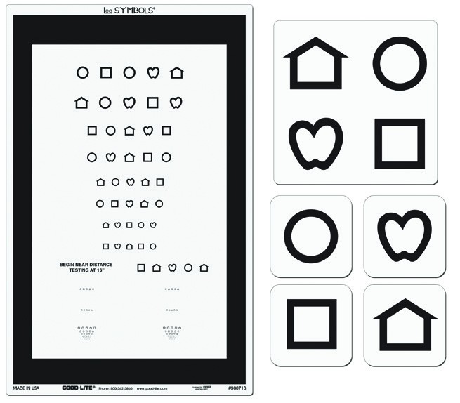 This pediatric eye chart features LEA SYMBOLS® pediatric symbols with 2 lines of linear-spaced optotypes in the following size equivalents: 20/40, 20/32, 20/25 and 20/20. Distance screening for these lines is 10 ft, 3 meters.