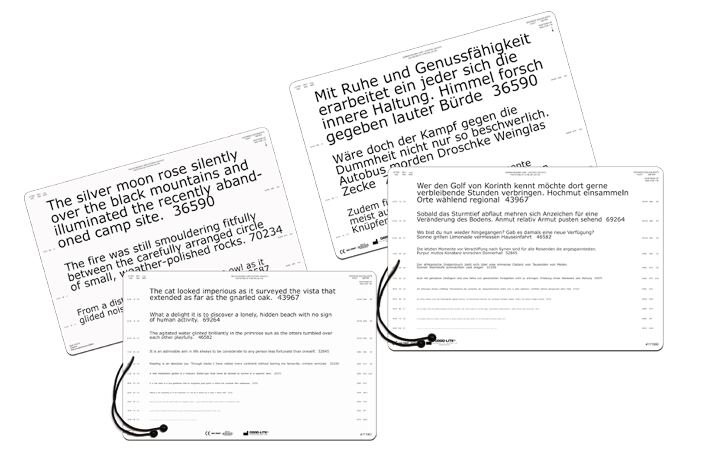 Available in either English or German language near vision reading card with 16" (40 cm) attached measuring cord for easy measurement. Chart contains continuous text with line sizes ranging from 20/320 to 20/16 (6/95 to 6/4.8) equivalent. The card also contains Letter Size, Decimal, logMAR, and M Size notations. Chart measures 15" x 10" (25.5 cm x 38.5 cm).