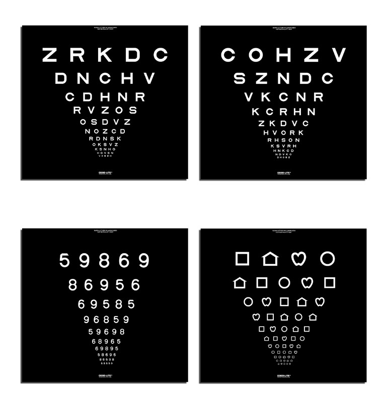 High contrast charts for the Super Pinhole Macula Cabinet. Optotypes are Proportionally spaced (logMAR) lines; line sizes ranging from 20/100 to 20/20 (6/30 to 6/6) equivalent, 0.25 to 1.25.