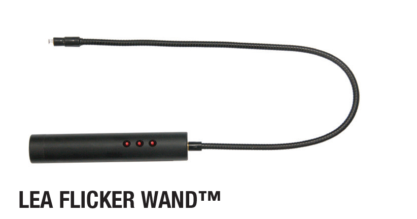 The LEA Flicker Wand is 26.5" (67.3 cm) long with a 20" (50.8 cm) flexible wand with a diode at the end that can be used as either a flickering or non-flickering stimulus at 4, 40, and 400 cd/m2. The curved wand is moved from behind the person forward in all 4 quadrants of the visual field to detect losses in the periphery of the visual field.