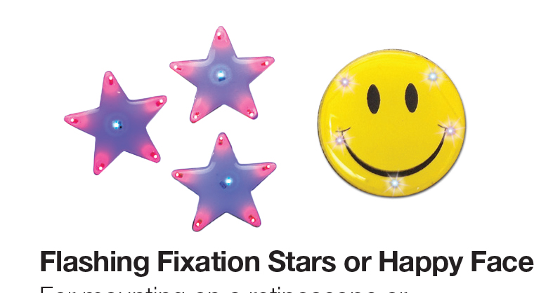 For mounting on a retinoscope or ophthalmoscope; includes 3 Flashing Fixation Stars or 2 Flashing Happy Faces.