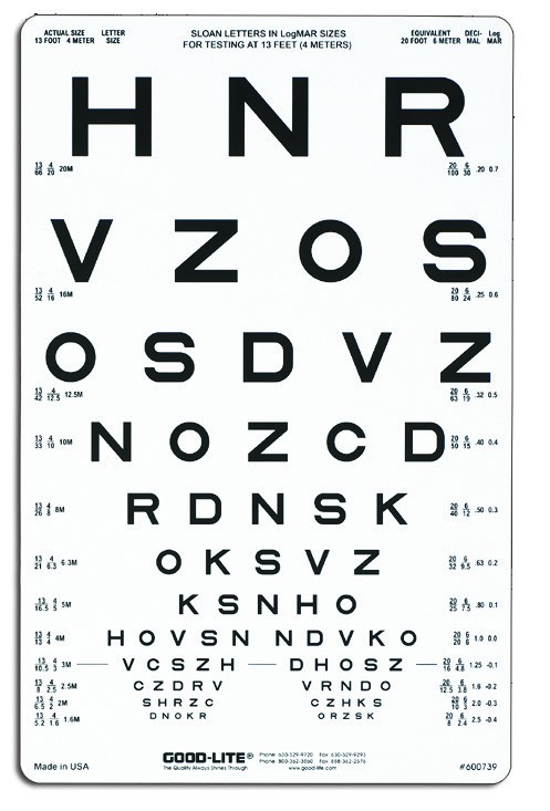 Proportionally spaced (logMAR) lines; line sizes range from 20/125 to 20/10 (6/38 to 6/3) equivalent, 0.16 to 2.00.