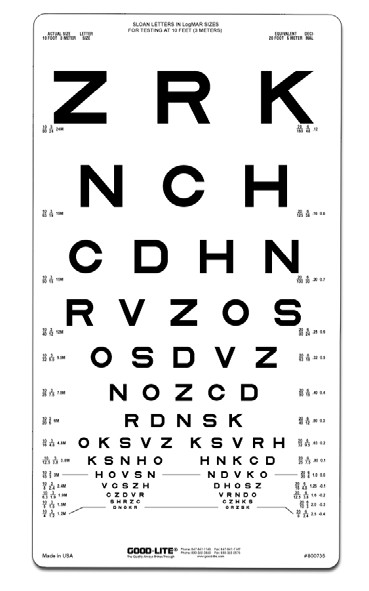 Proportionally spaced (logMAR) lines; line sizes range from 20/160 to 20/8 (6/48 to 6/2.4) equivalent, 0.12 to 2.50.