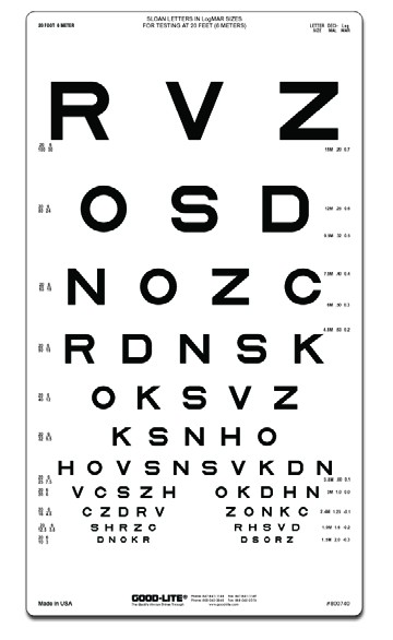 Proportionally spaced (logMAR) lines; line sizes range from 20/100 to 20/10 (6/30 to 6/3), 0.20 to 2.00.
