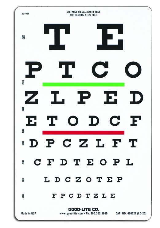Linear-spaced lines; line sizes range from 20/100 to 20/16 (6/30 to 6/4.8), 0.20 to 1.25. Lines are labeled with 20' notations only.