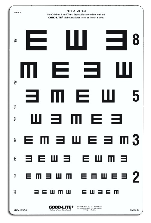 Linear-spaced lines; line sizes range from 20/80 to 20/16 (6/24 to 6.48), 0.25 to 1.25. Lines are labeled with 20' notations only.