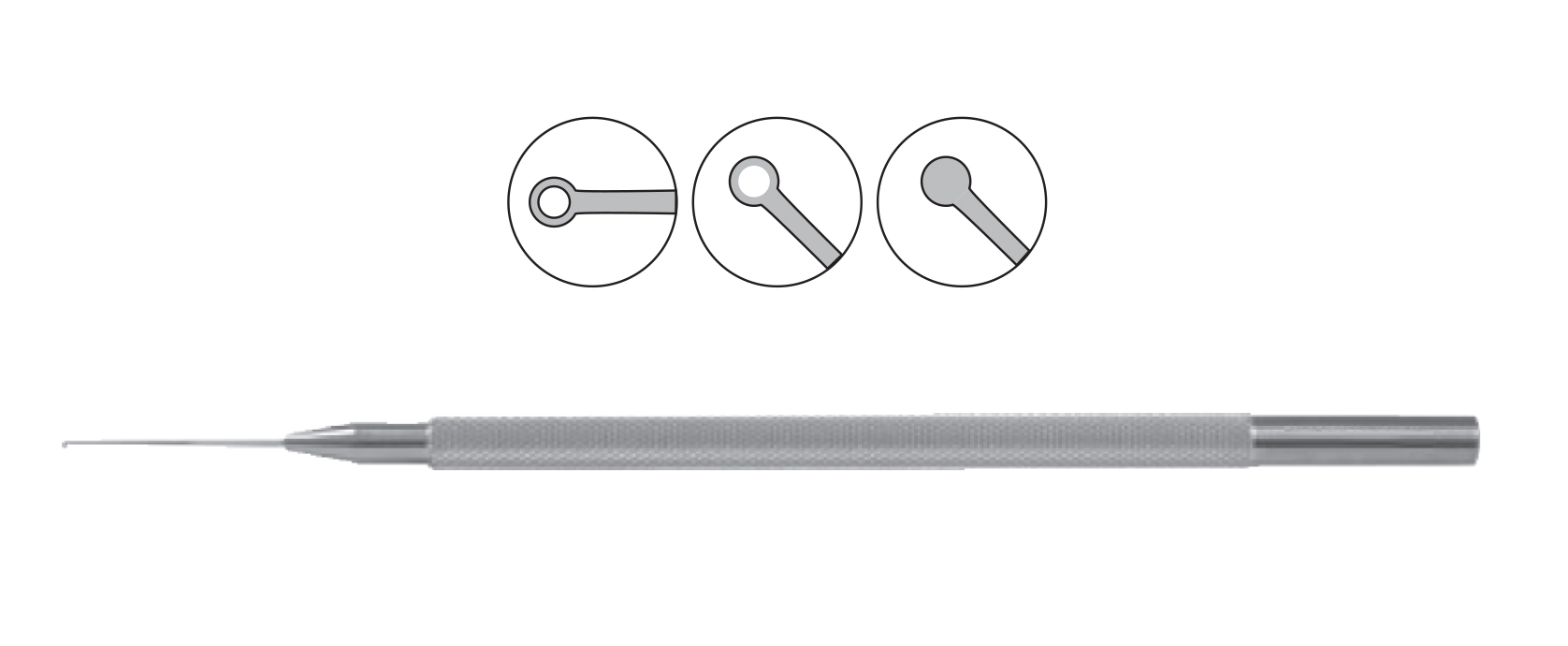 0.5mm inside diameter, 0.8mm outside diameter, rounded tip Round handle, length 121mm