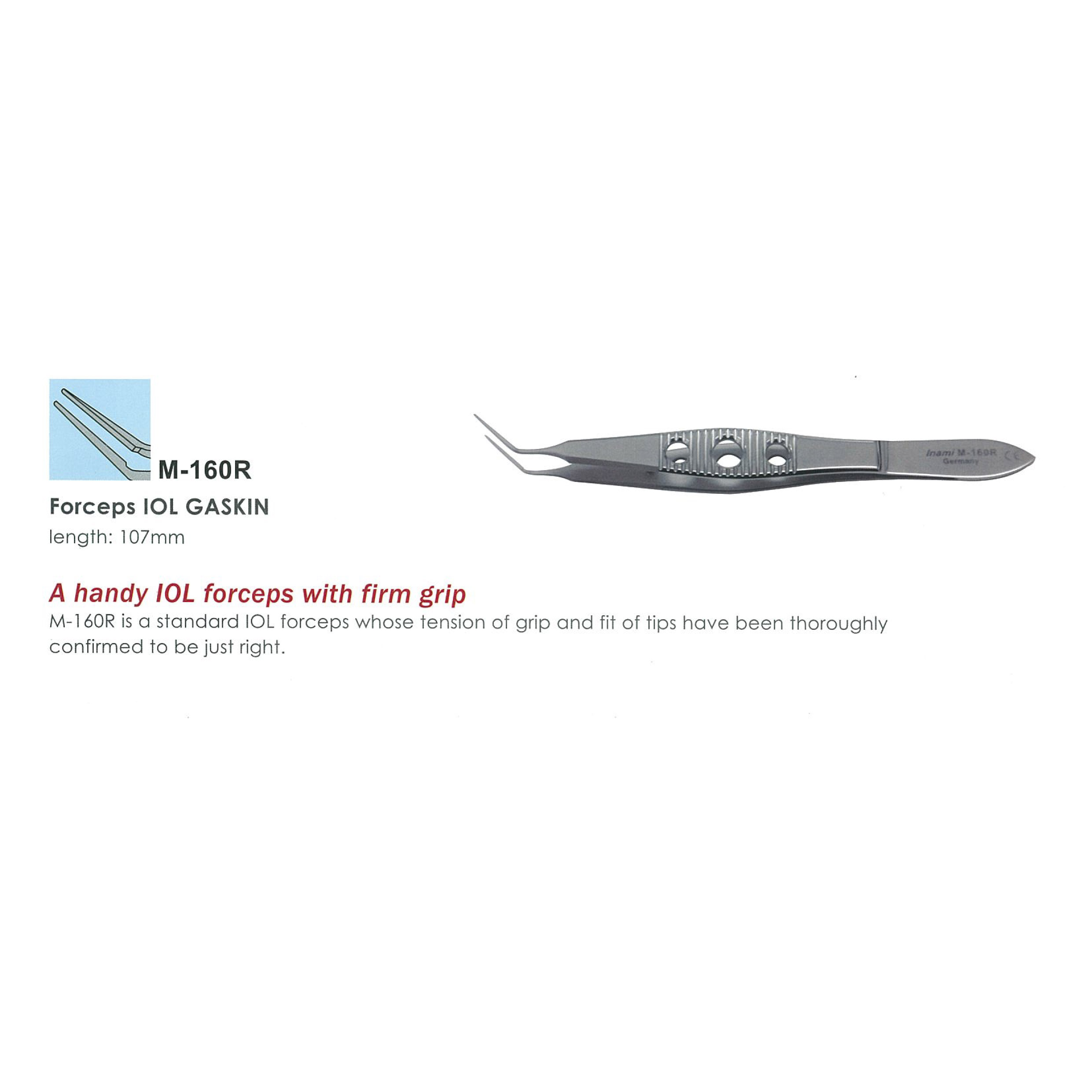 M-160R is a standard IOL forceps whose tension of grip and fit of tips have been thoroughly confirmed to be just right.
