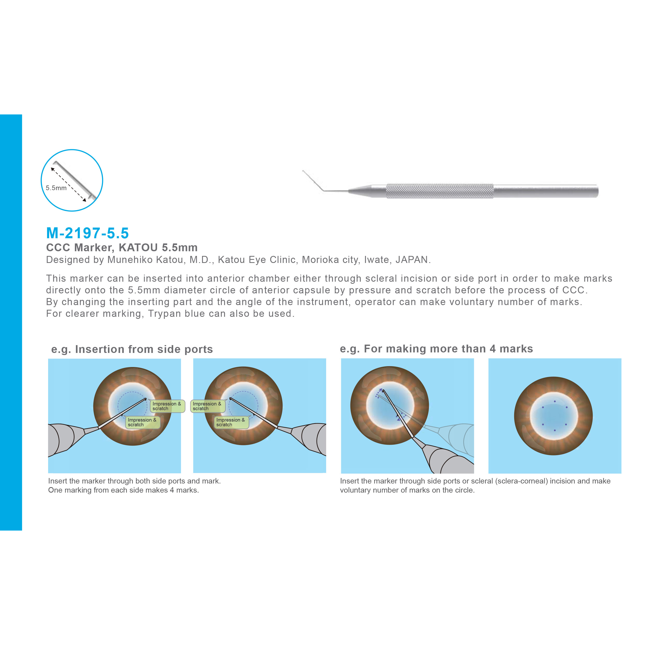 This marker can be inserted into anterior chamber either through scleral incision or side port in order to make marks directly onto the 5.5mm diameter circle of anterior capsule by pressure and scratch before the process of CCC.