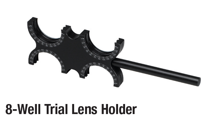 Easily use your existing trial lenses with this handheld 8-Well Trial Lens Holder. Contains 2 lens holders, 2 lens holders with axis scale, and nose bridge with a handle. Made of sturdy black plastic for long lasting durability.
