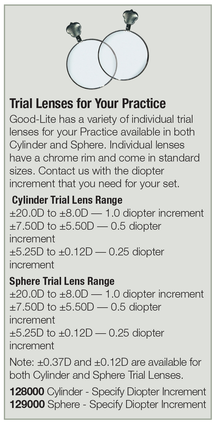 Good-Lite has a variety of individual trial lenses for your Practice available in both Cylinder and Sphere. Individual lenses have a chrome rim and come in standard sizes. Contact us with the diopter increment that you need for your set.